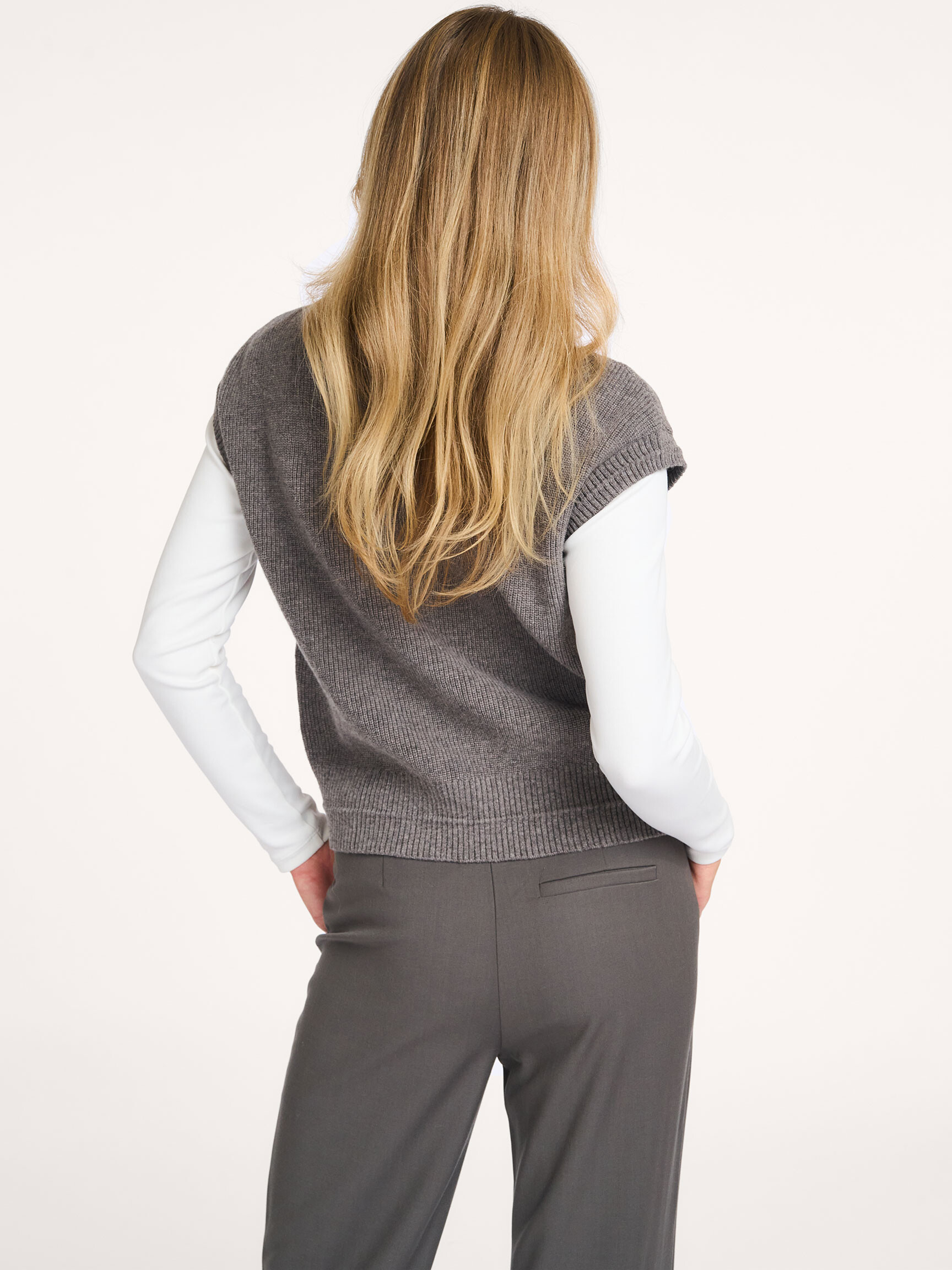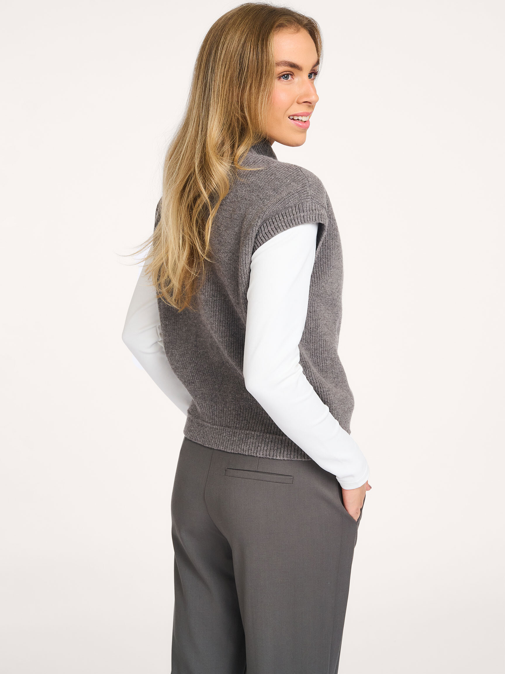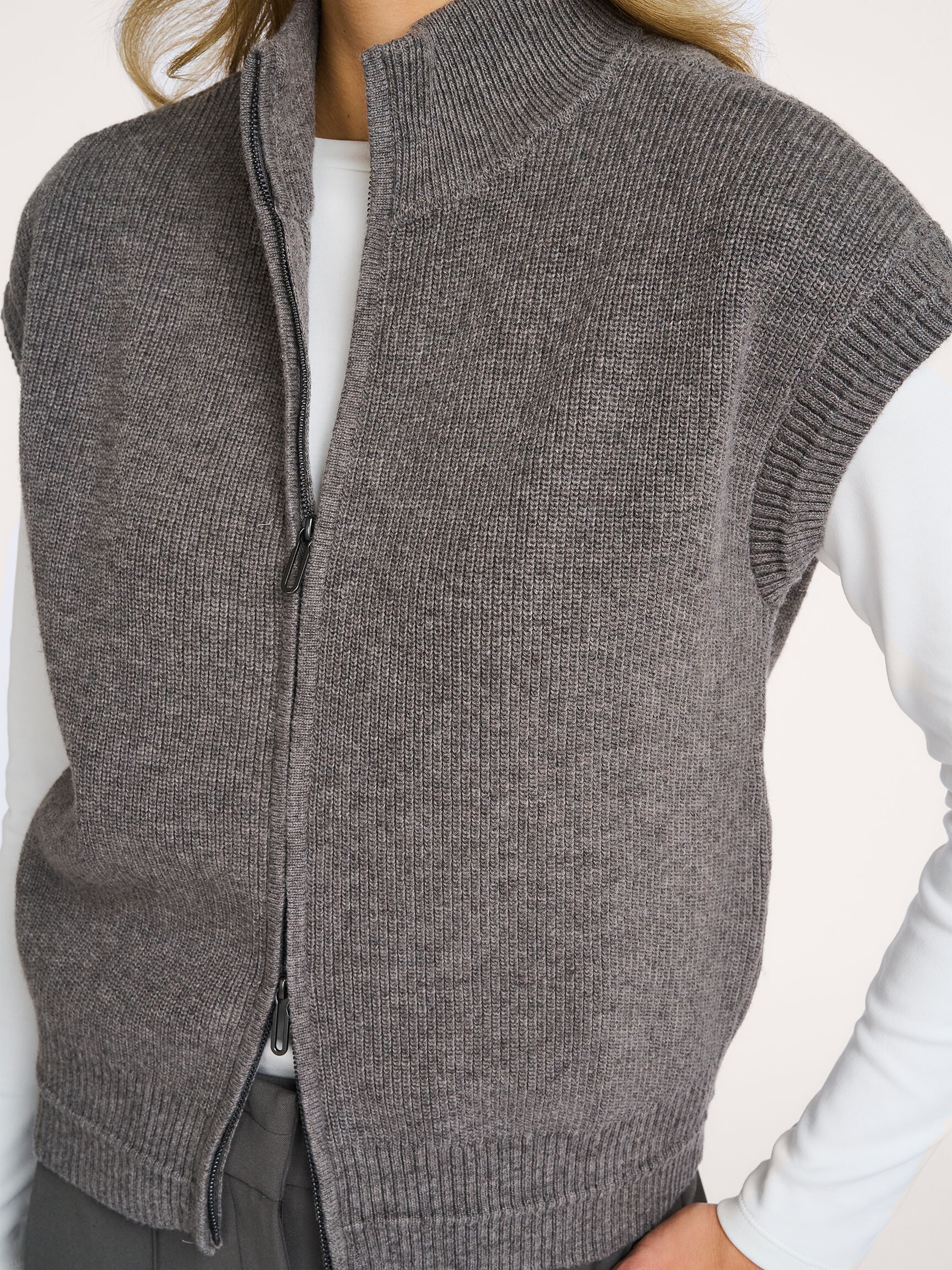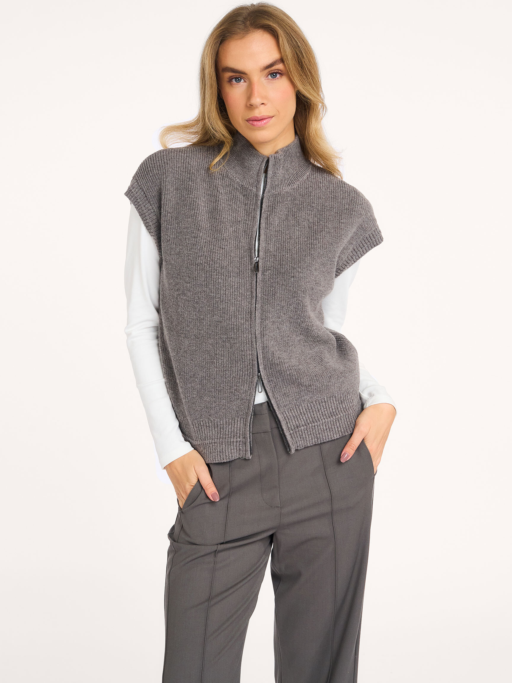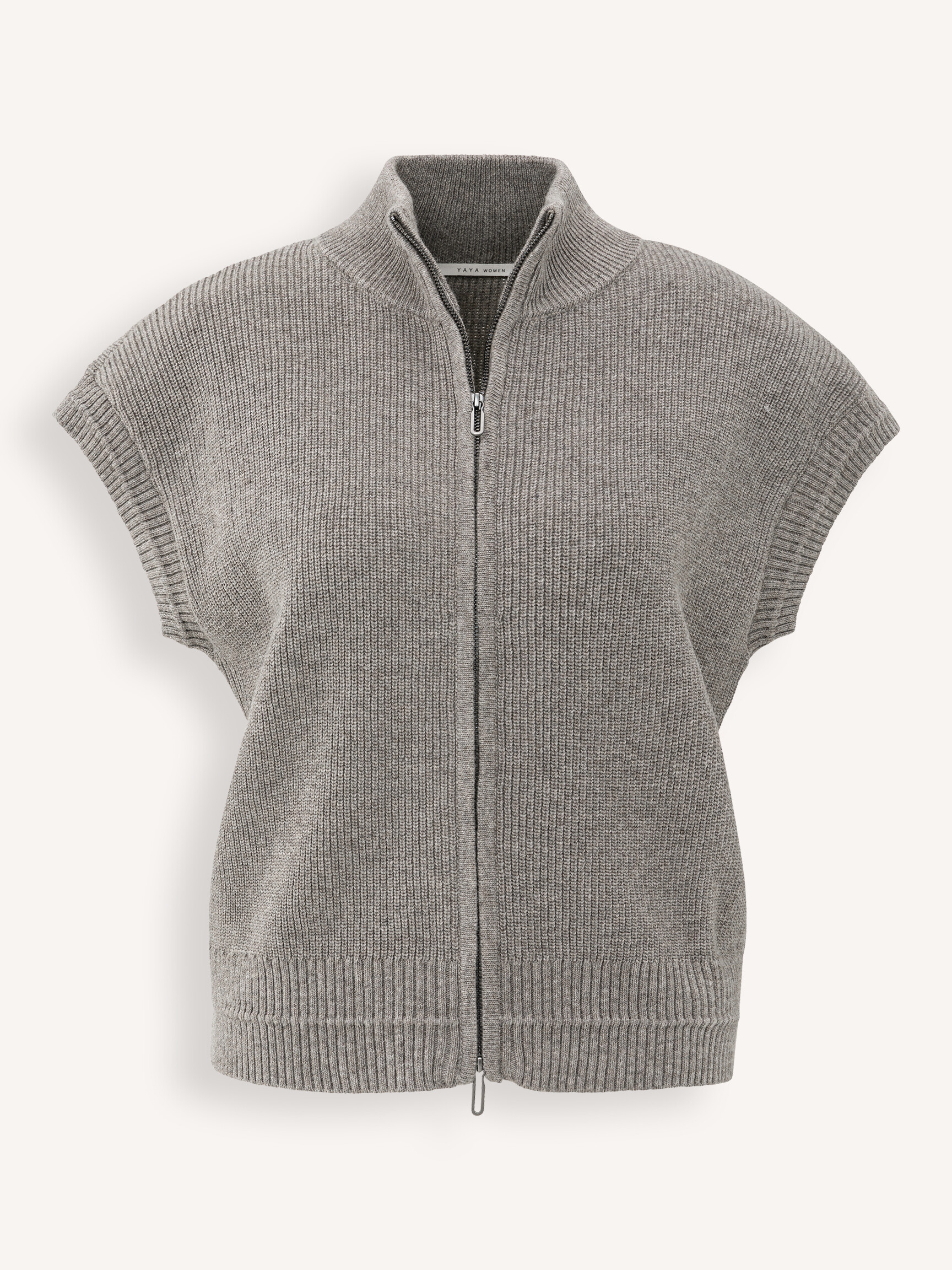 - Style: Sleeveless zip-up cardigan with stand-up collar 01-010132-510 99032 TAUPE GREY