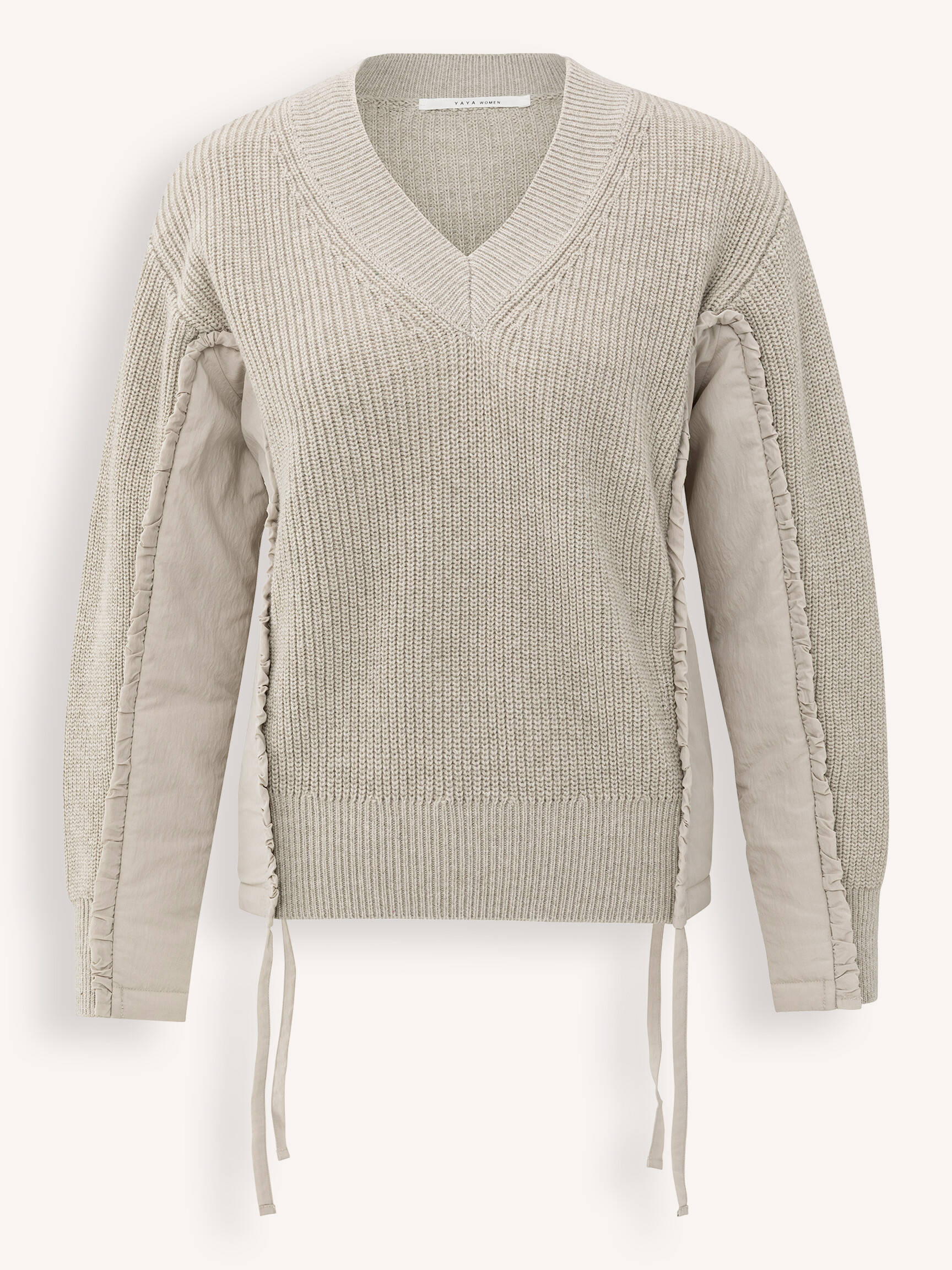 - Style: V-neck sweater with woven insert details 01-000509-510 99031 CLOUD GREY
