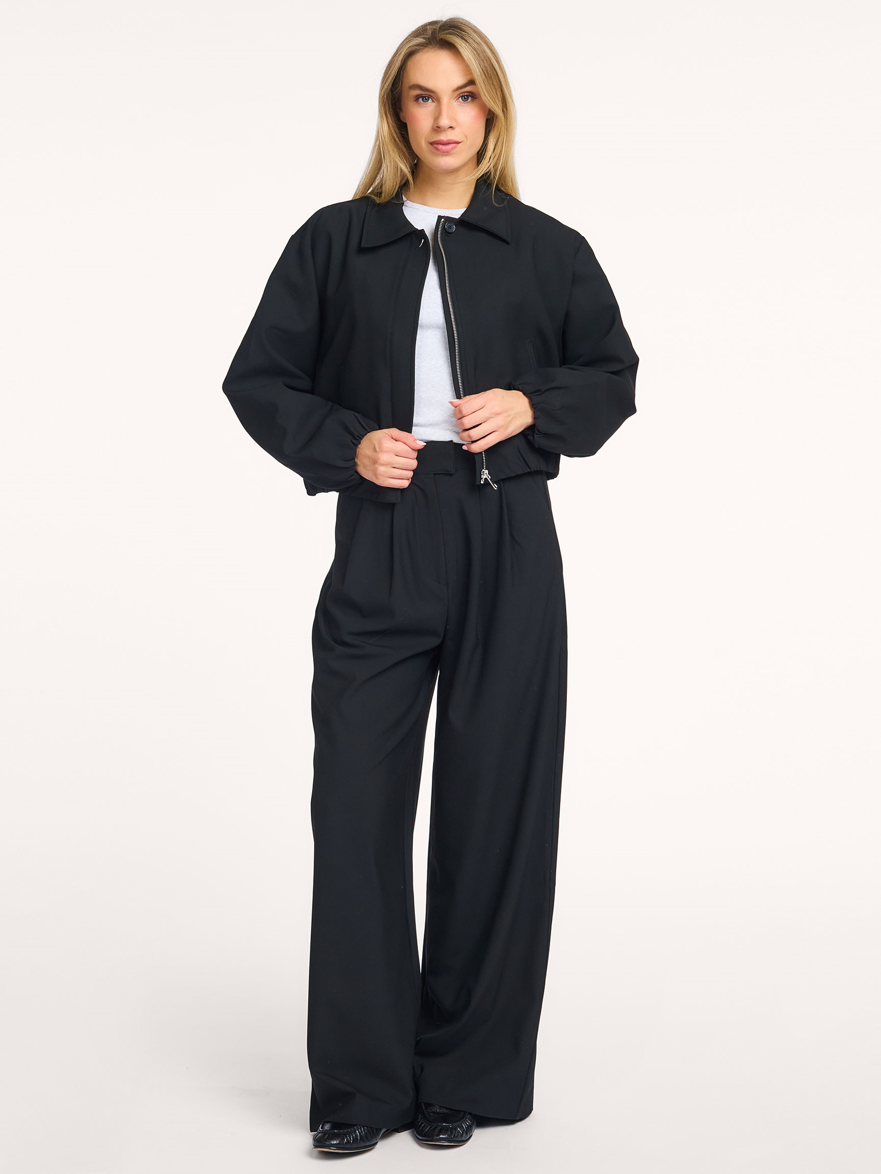 - Aangerimpeld elastiek onderaan mouwen