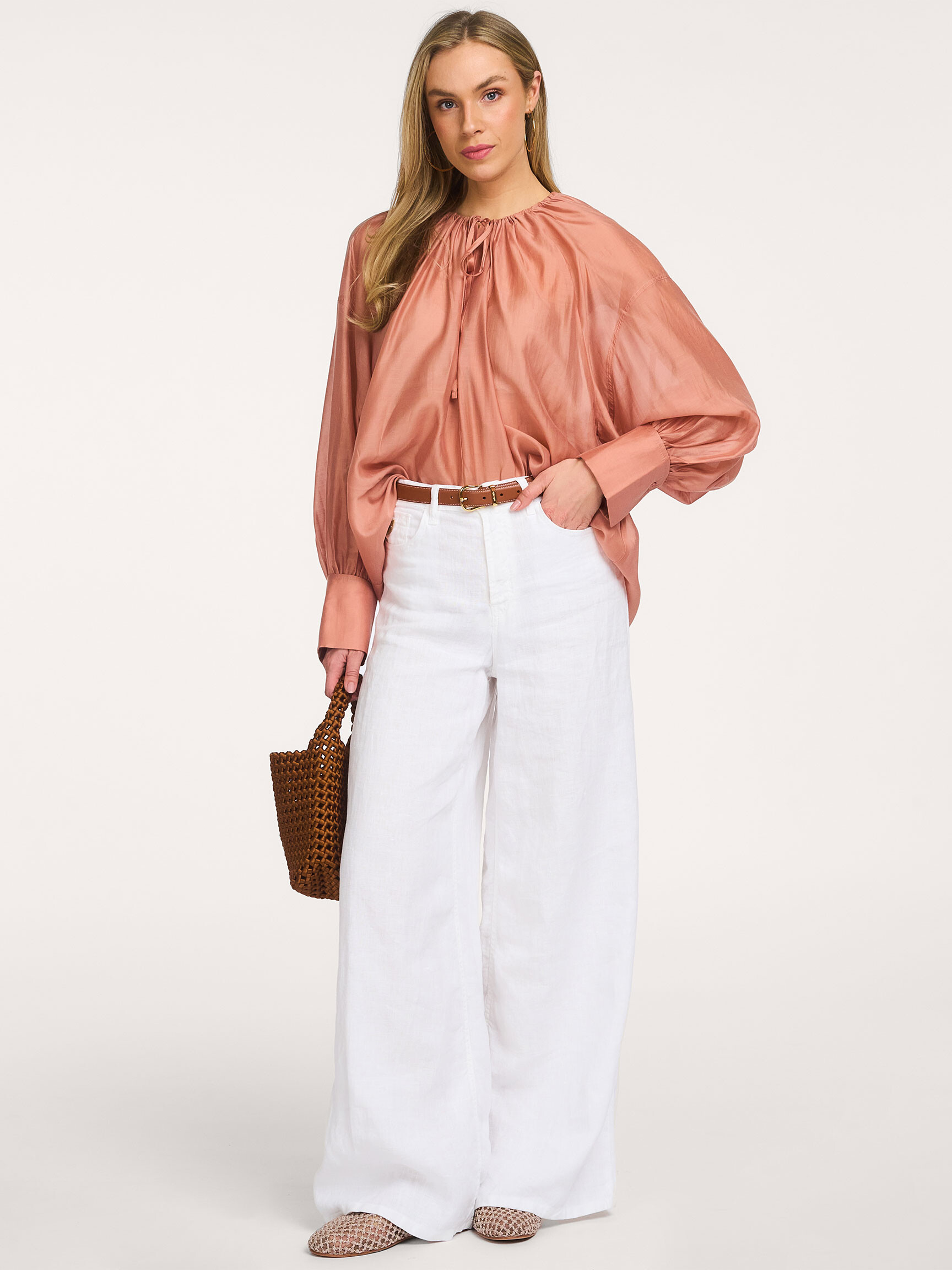 - Ronde halslijn met split en linten om te strikken